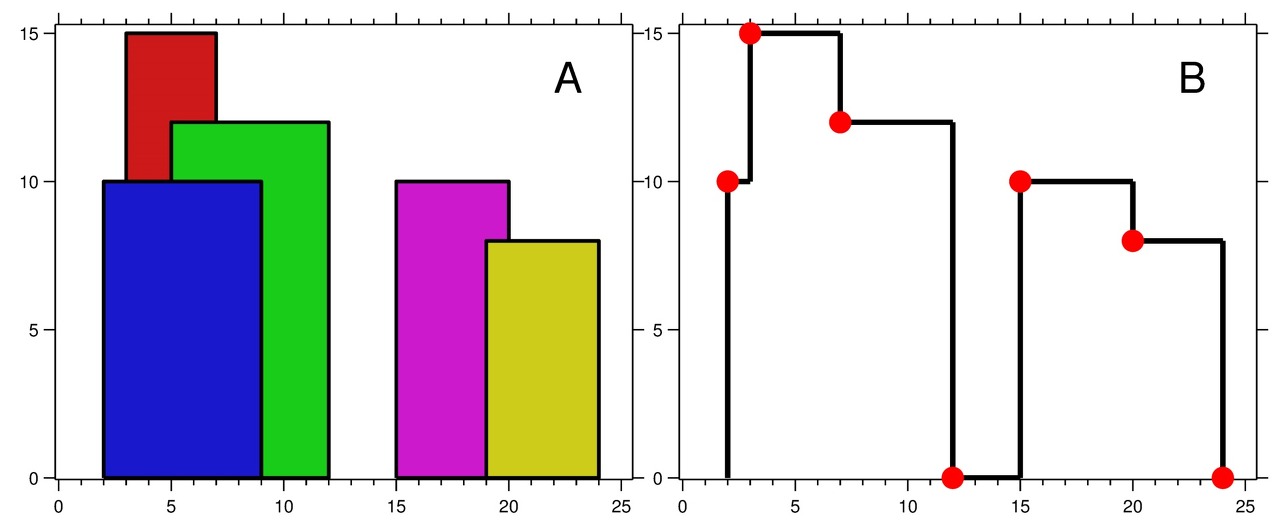 Figure B shows the skyline formed by those buildings. The red points in figure B represent the key points in the output list.