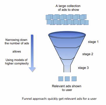 Funnel Approach 는 각 단계가 적은 광고를 가지고 데이터를 처리할 것이다. 이 방법은 이후의 각 단계들에서 복잡한 모델들을 안전하게 사용할 수 있도록 도와준다.