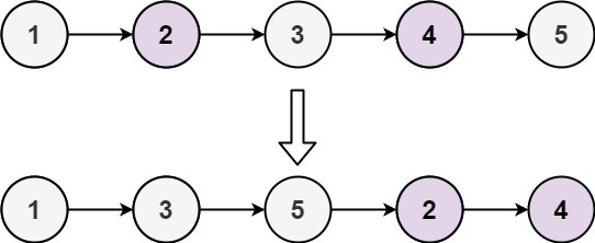 - 맨앞에 홀수 번째로 구성된 링크드리스트가 있어야하며 그 뒤에는 짝수 번째의 노드들이 연결되어야한다.